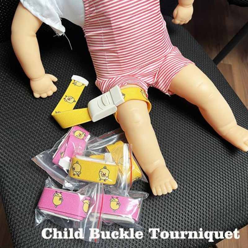 Pædiatrisk spænde tourniquet, lavet af blødt og elastisk materiale. Sammenlignet med voksne tourniquets er pædiatriske spænde tourniquets størrelse, så de passer til børns arme eller ben. De muliggør præcis kontrol af blødning uden at udøve for stort pres på børns blodkar og hud.